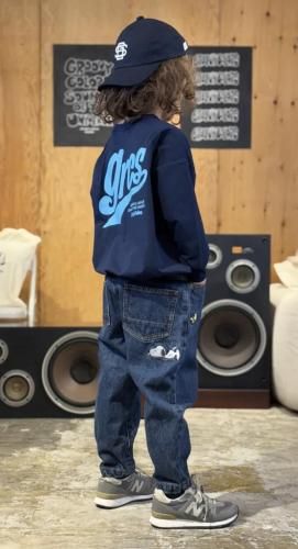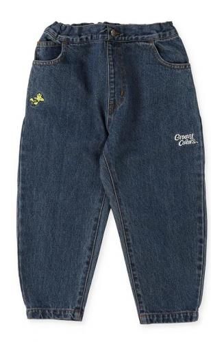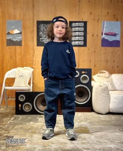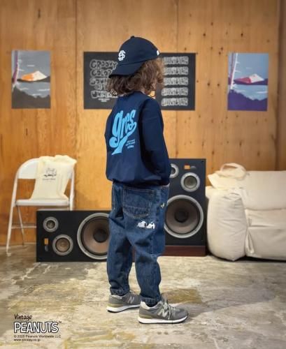 PEANUTS×GROOVY COLORSコラボ商品。時間と手間をかけて染色した糸を使用し、加工後に深みがある表情の本格的なムラ糸デニム。少しゆったりとした程よい太さのコクーン型。ウエストを釦で調整できるアジャストゴム仕様。左前にブランドロゴ刺繍。右前にWOODSTOCKの刺繍。右後ろに寝そべった姿のSNOOPYの刺繍。