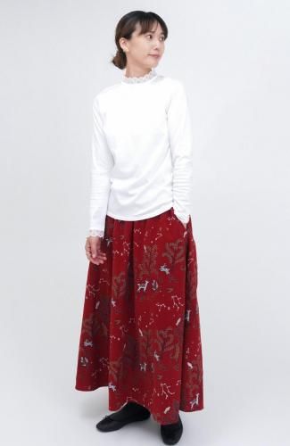 ウエストにギャザーを寄せ、ふんわりとしたシルエットが女性らしく、歩いた時の揺れ感が綺麗なフレアスカート。ウエストは後ろのみゴム仕様で着心地抜群。総刺繍の華やかさがあり、Tシャツやニットなどのベーシックなトップスに合わせるだけでサマになる一着です。