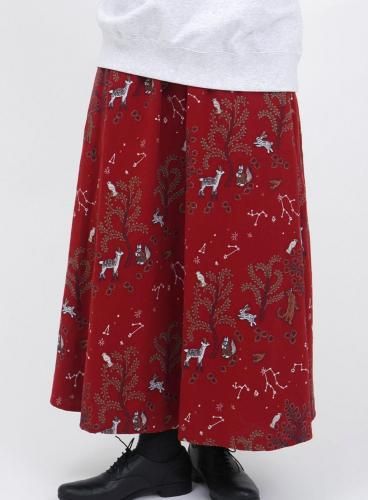 星座が輝くしんと澄んだ冬の夜空の下、原生の森が広がっています。マーブルらしいダイナミックな刺繍の風景柄です。冬の星座の下、トラやリス、シカ、ウサギ、鳥たちが登場します。やや起毛感があり温かみを感じられるコットン素材です。
