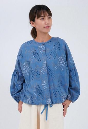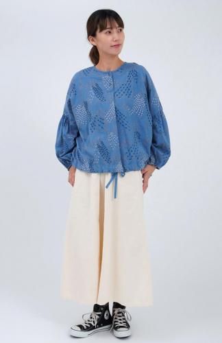 前裾に通した紐で絞りを入れてシルエットの変化を楽しめるシャツ。前後差のある着丈は、パンツ・スカート共に合わせやすく、裾を絞ってトップスとして、ボタンを開けて羽織りとしてもお召しいただけます。