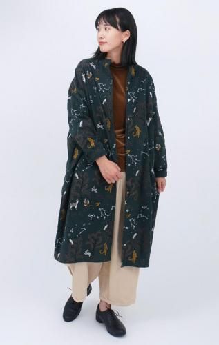 星座が輝くしんと澄んだ冬の夜空の下、原生の森が広がっています。マーブルらしいダイナミックな刺繍の風景柄です。冬の星座の下、トラやリス、シカ、ウサギ、鳥たちが登場します。やや起毛感があり温かみを感じられるコットン素材です。