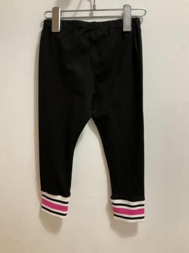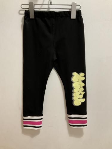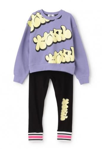 大胆なグラフィティロゴプリントをあしらったトレーナーと、配色ラインを効かせた裾リブレギンスの組み合わせ。